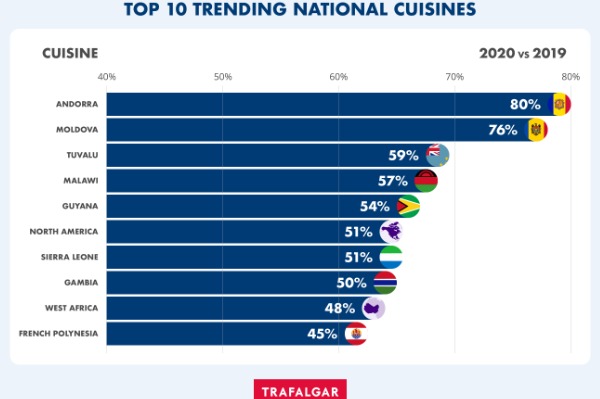 - One of the most intriguing trends uncovered a desire for food travel to one of the world’s tiniest countries: Andorra. With 80% more searches about their national cuisine, Trafalgar predicts there will be a global appetite to explore this landlocked nation once worldwide travel resumes.