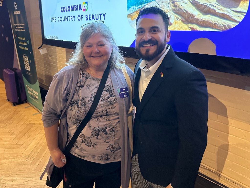 Prize winner Laurraine Payne of Rainy Day Travel Services with  ProColombia’s Juan Sebastian Sanchez Chica