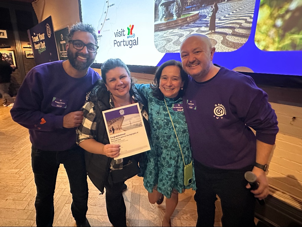 G Adventures’ Nuppy Mistry (l) and David Green (r) with prize winner Diane Adamo of Envoyage and Visit Portugal’s Inês Almeida Garrett
