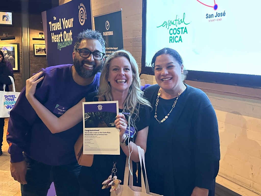 Nuppy Mistry of G Adventures with winner Jacqueline Hider of Marlin Travel and Jazmin Jimenez of Essential Costa Rica/VoX International Inc.