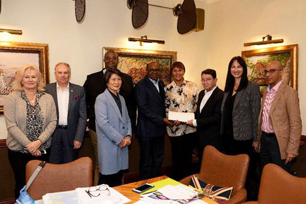 Minister of Tourism and Co-Chair of the Global Tourism Resilience and Crisis Management Centre (GTRCM), Hon Edmund Bartlett (4th L) and Dr. Taleb Rifai, Co-Chair of the GTRCM and former Secretary General of the UNWTO (2nd R), hand over US$50 thousand for relief efforts to Director General of the Ministry of Tourism and Aviation of the Bahamas (C). Sharing in the moment from (l-R) are GTRCM Board Members, Daniela Wagner, Head of International Partnerships at Jacobs Media Group, Mario Hardy, Chief Executive Officer of the Pacific Asia Travel Association, DHO Young-shim, Chair UN SDGs Advocate Alumni and Elena Kountoura, former Minister of Tourism for Greece; along with Executive Director of the GTRCM, Professor Waller (2rd L) and Ibrahim Ayoub, Group CEO of Daiichi (R).