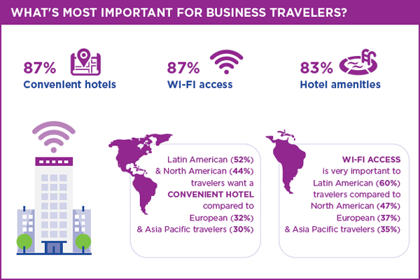 Convenient hotels and consistent Wi-Fi access top the list of most important factors for business travellers while on the road. Latin American (52%) and North American (44%) road warriors are much more likely to want to stay at a conveniently located hotel to where they need to be for their trip compared to travellers in Europe (32%) or Asia Pacific (30%).