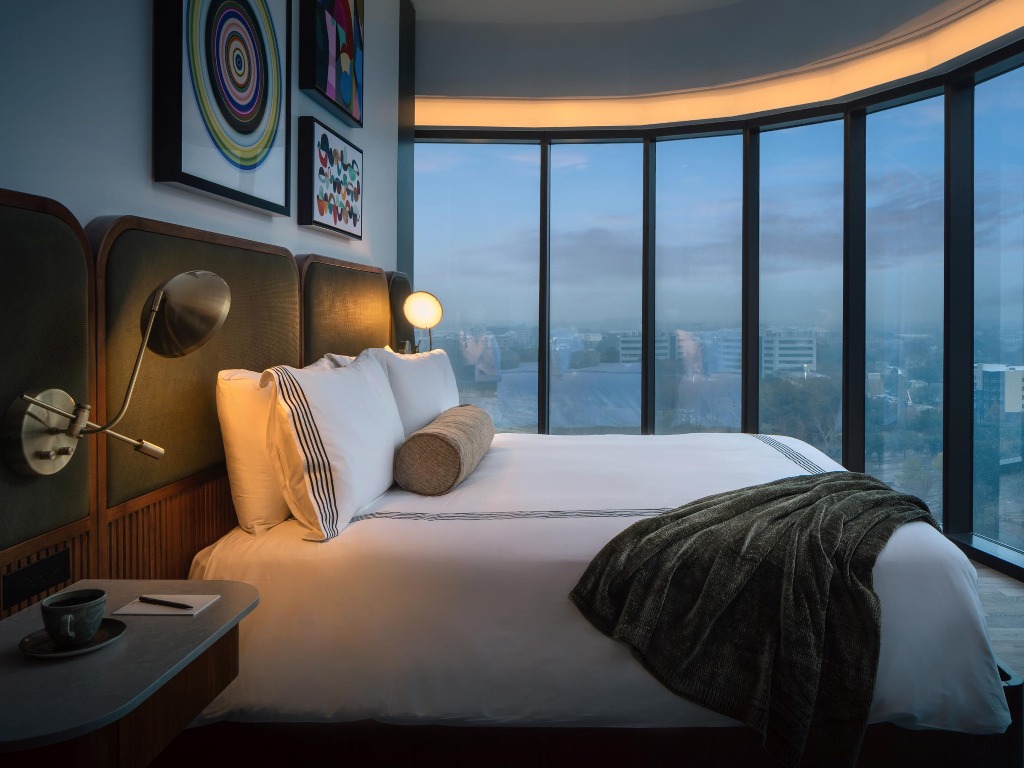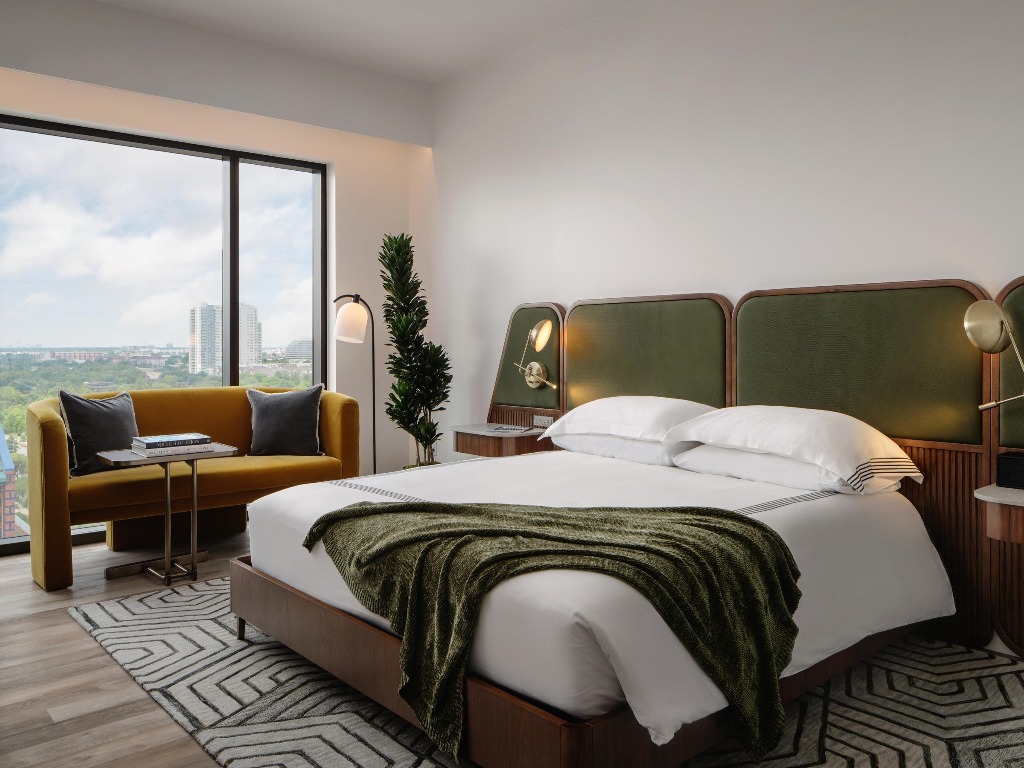 The new-build hotel is housed within a sleek glass and exposed-steel building that displays curved lines designed by award-winning architect, HOK.  Interiors are designed by Houston-based architecture and design firm Abel Design Group featuring warm earthy colours, organic materials, brass fixtures, and hardwood floors paying homage to the hotel’s natural setting of nearby Buffalo Bayou Park.