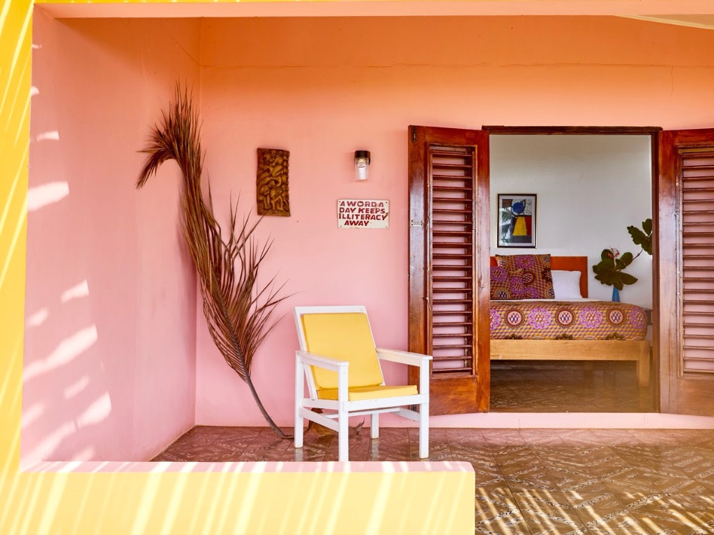 Her palette is the Caribbean itself: turmeric yellows, bougainvillea pinks, sea-washed greens. The architecture isn’t architecture as much as it was sculpture — an invitation to live inside color, shadow, breeze, and memory. Her touch still defines Jakes today: every room feels personal, crafted, and soulful, as if the house itself is telling a story.