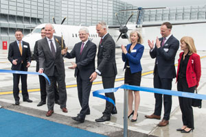 Pictured are Garneau with PortsToronto CEO Geoffrey Wilson and PortsToronto Chair Robert Poirier as they cut the ribbon to officially open the new Ground Run-Up Enclosure at Billy Bishop Toronto City Airport.