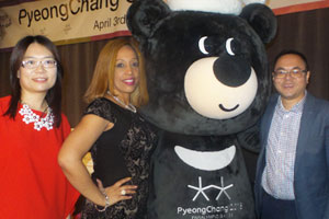 Seen here at the Toronto event with a PyeongChang games mascot are Lisa Lau of TaiPan Tours, Jackie Bishop Martin of Journey the Globe and Harold Ho of Royal Scenic.