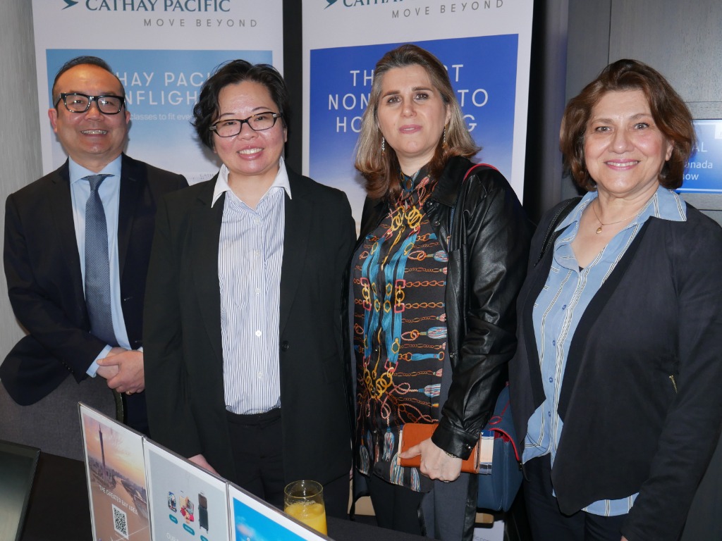 Executive reps for Cathay Pacific Airways (l. to r.) Marks Johannus and Sylvia Pong, met with travel advisors (l. to r.) Nafiseh Hosseini and Jila Shariatmadari, both of Simply Travel & Tour in Burnaby BC, during a small trade show at the recent Mondee Canada event in Burnaby, near Vancouver.