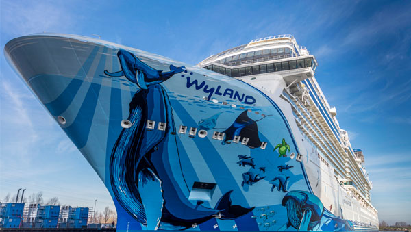 Part of the excitement of the float out was the public debut of the ship’s signature hull artwork designed by world-renowned marine life artist and conservationist, Wyland. Best known for his marine life paintings, sculptures and grand scale murals, or “Whaling Walls,” Norwegian Bliss’ hull design is named “Cruising with the Whales” and features an image of a mother humpback whale and her calf as the centrepiece of the design, representing the beauty of Alaska’s wildlife.