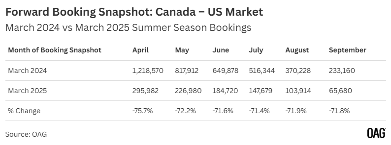 And although OAG schedules data suggests that airline capacity between Canada and the US remains broadly unchanged for the summer season, a closer look at recent weeks reveals a downward trend in airline capacity and a sharp decline in forward bookings.
