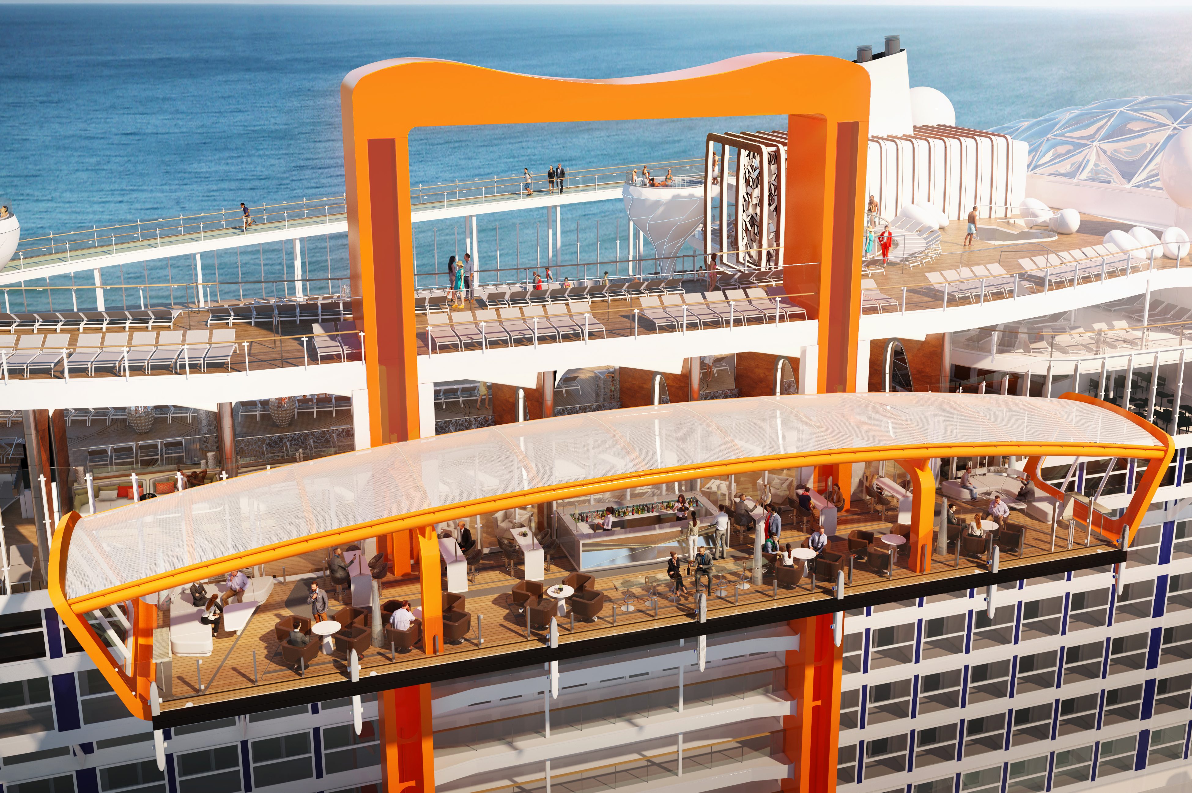 Unique features on the 2,918-passenger ship include a revolutionary 90-ton platform – dubbed the Magic Carpet – the size of a tennis court that will be cantilevered over the side the ship and serve as a tender boarding platform on Deck 2 and a venue for “Dinner on the Edge” on Deck 16.