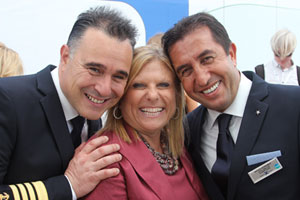 Pictured top, Celebrity president Lisa Lutoff-Perlo with Captain Costas Nestoroudis and hotel director Niyazi Korkmaz. Below, Lutoff-Perlo with designer Nate Berkus (l) and Richard Fain, chairman of Royal Caribbean Cruises Ltd. (Celebrity’s parent company).