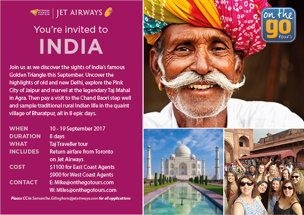 In partnership with Jet Airways, On The Go Tours is holding a Sept. 10-19 fam to India.