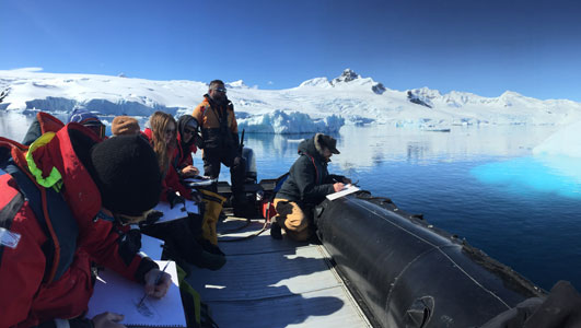 Also sailing on this voyage will be a newly appointed Arctic Artist-in-Residence for Friends of Scott Polar Research Institute’s (FoSPRI), Lesley Burr. Chosen from a host of applicants who applied for an annual residency sponsored by OOE onboard RCGS Resolute, Lesley successfully gained her place following a proposal to chronicle imagery of the Arctic, responding directly to what is seen, heard and found, using sketchbooks, studies and photographs to record experiences and observations first-hand.
