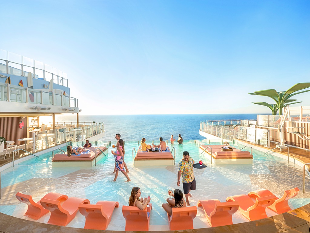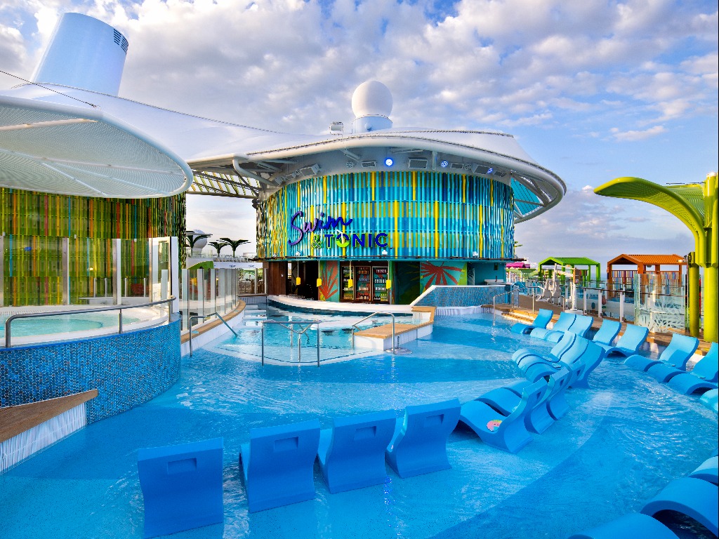 Chill Island  The three-deck slice of paradise is home to four of seven pools, each with different vibes and prime ocean views, including swim-up bar Swim & Tonic and Royal Bay, the largest pool at sea. With live bands and DJs, and places for drinks and quick, casual food just steps away, like The Lime & Coconut, vacationers can chill day and night.