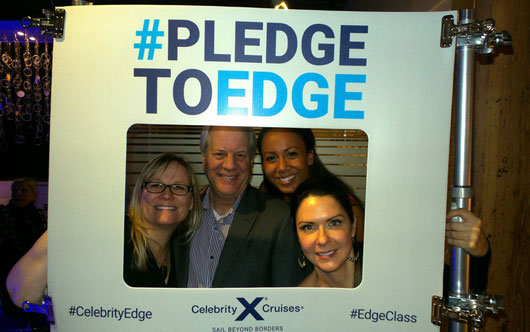Celebrity Cruises unveiled some of the “secrets” about its newest ship – Celebrity Edge – during an industry event in Toronto last night. Unique features include a revolutionary 90-ton platform – known as the Magic Carpet – the size of a tennis court that will be cantilevered over the side the ship and serve as a tender boarding platform on Deck 2 and a venue for “Dinner on the Edge” on Deck 16. Pictured at the event are Sandra Pennington, Ken Brooks, director of market sales, Canada, Maxine Gundermann and Jennifer Barker.
