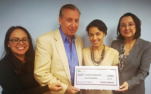 The Caribbean Hotel and Tourism Association (CHTA) recently presented cheques totaling $70,000 to hotel associations in Haiti and The Bahamas to assist residents in both countries with Hurricane Matthew relief efforts. Pictured, hotelier Agnes Pierre-Louis receives Haiti’s donation from (l-r) Vanessa Ledesma, Frank Comito and Karolin Troubetzkoy of the Caribbean Hotel and Tourism Association.
