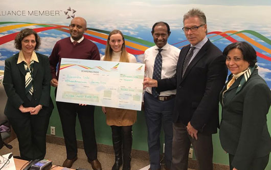 Ethiopian Airlines Canada is excited to “share” the news that Alexandra Locke is the winner of the airline’s first social media contest. The Facebook contest engaged followers to “Like and Share” for a chance to win two business class tickets to Africa. The airline ran the contest for a couple months, increasing the overall social media presence and creating interest for the brand and all the destinations Ethiopian Airlines flies. “We are very pleased with the number of fans and interest in our contest. We especially enjoyed reading all the comments and enthusiasm shared by many,” said Birhan Abate, Ethiopian Airlines Canada country manager. “This was the first one, but not the last, we have many more exciting events planned for this year.” Ethiopian Airlines’ Canada management team is pictured with Ethiopian Airlines’ Canada Country manager Birhan Abate presenting Locke with her tickets.