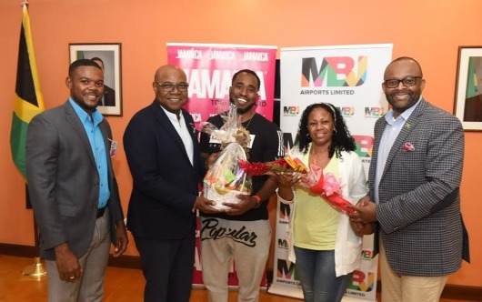 Deputy Mayor, Montego Bay, Richard Vernon (at left); Minister of Tourism, Jamaica, the Hon. Edmund Bartlett (second from left); and Director of Tourism, Jamaica Tourist Board, Donovan White; present gifts to Jamaica’s one millionth stopover visitor Brian Simmons (center) and Brian’s mother and traveling companion, Monica Simmons (second from right) upon their entry into Montego Bay’s Sangster International Airport on June 15, 2022.