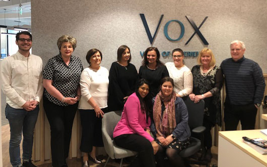 Baxter Media recently dropped in to visit VoX International at their new offices in Toronto. Situated on the Lake (Ontario), the brand new offices are as far downtown as you can get. We had a chance to sit and think in the Collaboration Room and play with the up/down buttons on their new desks. Overall it was a very productive get together. In the picture (l-r) are Braden Rosner, Rosalyn Hunter, Gerlinde Perera, Hannah Choat, Wendy McClung, Ashley Rochefort, Susan Webb, Paul Larcher. Seated, Rita Spizzirri and Emily McClung.