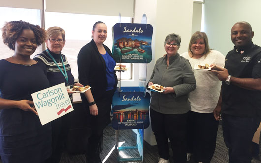 It’s not every day when a top chef from Jamaica delivers jerk chicken to your office! Agents from Carlson Wagonlit Travel on Merivale Road in Nepean, Ont. enjoyed a tasty treat this week when Glenroy Walker, Group Senior Executive Chef for Sandals Resorts International dropped in with a jerk chicken lunch, along with Giselle Williams, business development vanager, Ontario, Unique Vacations Canada (pictured far left). Chef Walker, based at Sandals’ corporate office in Montego Bay, is in Ottawa to participate in the Jamaican Gastronomy Festival at the Sheraton Ottawa Hotel, held in partnership with the Jamaican High Commission and the Jamaica Tourist Board (March 21-23).