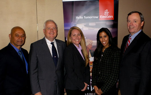 The Emirates road show hit Toronto last week, updating industry personnel on all that’s new at the airline, as well as information on Dubai. Pictured at the event, held at the Marriott Airport Hotel, are (l-r) Leyland Sampayo, Emirates, Robert Zuzek, Kompasxpress, Jessica Herring, Dubai Tourism, Soraya Alolama, Dubai Tourism, and Don McWilliam, Emirates.