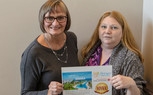 Helen Hayward (l) of The Travel Agent Next Door congratulates contest winner Bobbie W. on winning a trip for two to Jamaica, sponsored by Air Canada Vacations and Grand Bahia Principe. The Travel Agent Next Door contest helps agents to engage with clients and build their customer base.