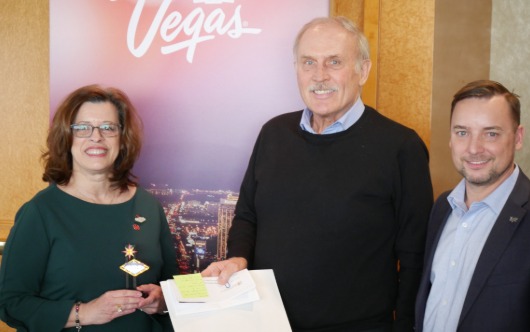 A Visit Las Vegas luncheon was held recently at the Pan Pacific Hotel in Vancouver, and airline partners were on hand with prizes for attending agents. Amongst them were Air Canada BC sales manager Edna Ray, who presented a Vegas package to Hank Oostveen, VP of Uniglobe Travel Western Canada. Joining them was Blair Hirtle (r), western Canada account manager for the Las Vegas Convention and Visitors Authority.
