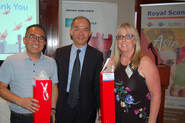 Pictured, at the end of a recent Japan tourism update event in Richmond two attending travel agents took home prizes from Royal Scenic Holidays. Ruel Cabusas (l) of Expedia CruiseShipCenters in Vancouver and Cheryl Gray (r) of Uniglobe LGI Travel in Vancouver joined Jerry Lo, VP Western Canada for Royal Scenic. The Japan update luncheon was sponsored by Japan Airlines and Royal Scenic.