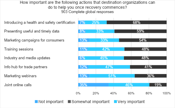 When asked how destination organizations (DMOs) can best help travel advisors and tour operators in recovery, the number one answer was clearly “introducing health and safety certificates for advisors to feel sure the destinations are safe to send their customers.” Two out of 3 participants requested help from the destinations. The next top three answers included marketing campaigns, presenting useful and timely data, and industry and media updates.