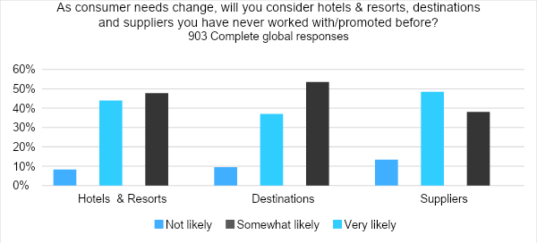 Almost 50% of respondents said that they were extremely likely to consider hotels and resorts they had never sold before. Additionally, another 37% said that it was somewhat likely they would consider other options. U.S. respondents answered similarly to their global counterparts.