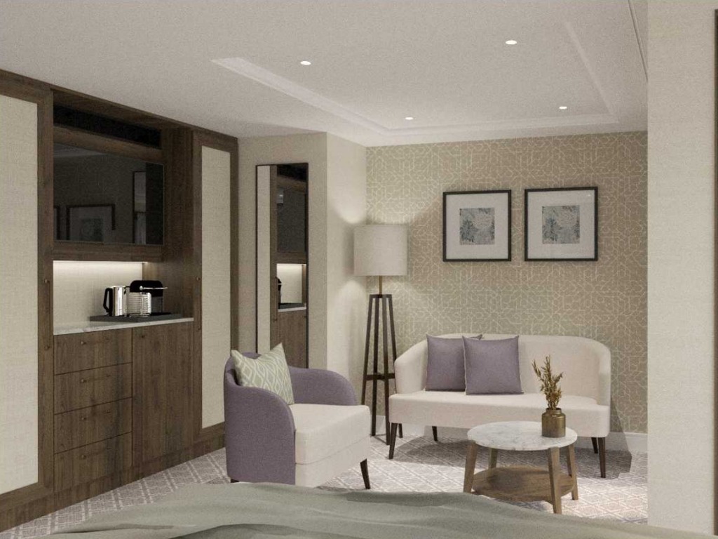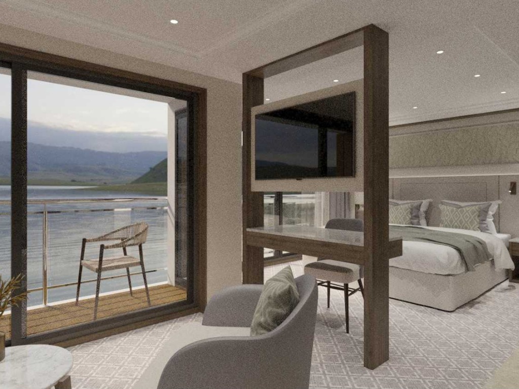 Superior suites will be 258 square feet and will have a French balcony with sliding doors and a seating area with lounge chair and small table. Double cabins will be 172 square feet and will have a seating area with lounge chair and small table. Upper- and middle-deck double cabins will have a French balcony with sliding doors, while lower-deck double cabins will have a smaller fixed window.