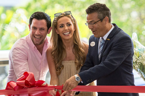 Pictured, Sandals Royal Barbados general manager Fernand Zievinger welcomes Shaunagh and Thomas Anderson as the resort’s first guests on Dec. 20.