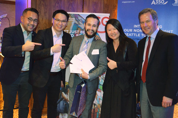 Frias was on the receiving end of a randomly drawn prize package that includes return flights to Singapore on Singapore Airlines with a space-available upgrade designation. He will be onboard one of the new flights that will be departing from Seattle (SEA) as of Sept. 3, when the new non-stop service to Singapore begins. The package also includes a three-night stay at the Shangri-La Hotel, as well as spending money.