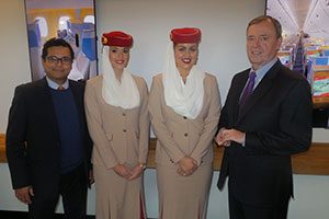 Seen here are Emirates’ Neville Gay (l) and McWilliam with two Emirates flight attendants.