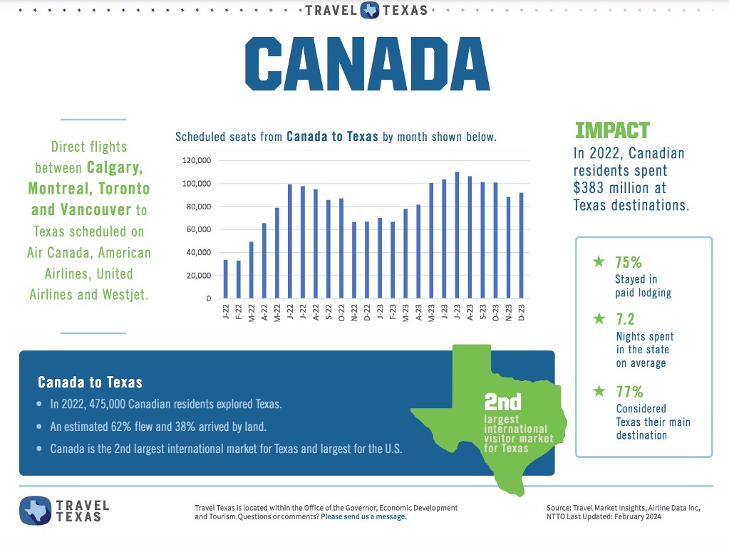 Although 2023 stats are not available yet, 475,200 Canadians travelled to Texas in 2022, representing 92 per cent of 2019 volumes, so all signs point to a full recovery for 2023.