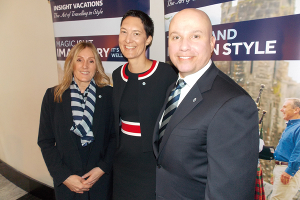 All smiles as they welcome some of their VIP partners to lunch on a sunny October day in Toronto, from l to r, are Insight Vacations’ vice-president of sales, Carla Brake; its CEO, Ulla Hefel Böhler; and its, president, Canada, Brad Ford.