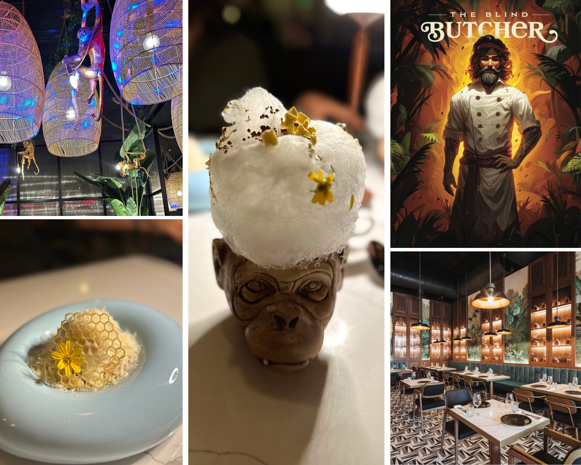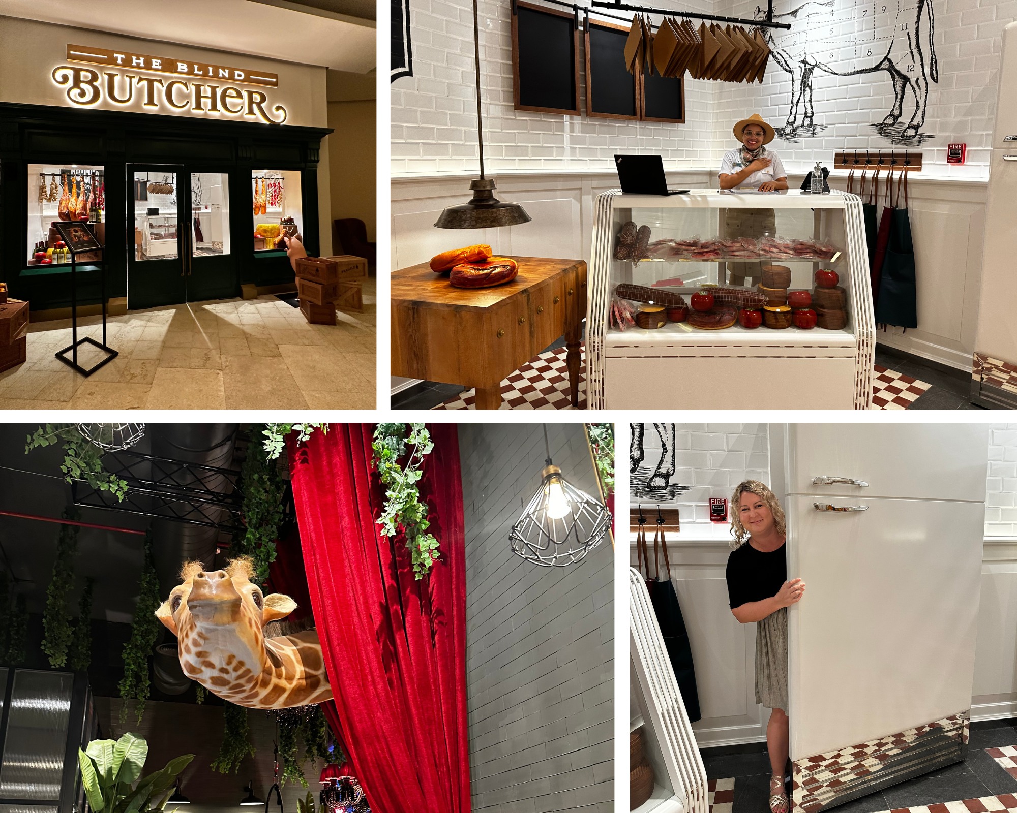 From the outside the newly opened The Blind Butcher is made to look like a typical unassuming butcher shop but upon passing through the secret fridge entrance, clients will be transported into a jungle-like setting complete with a giant giraffe, monkeys hanging from lights and a live acrobat dangling from the ceiling.