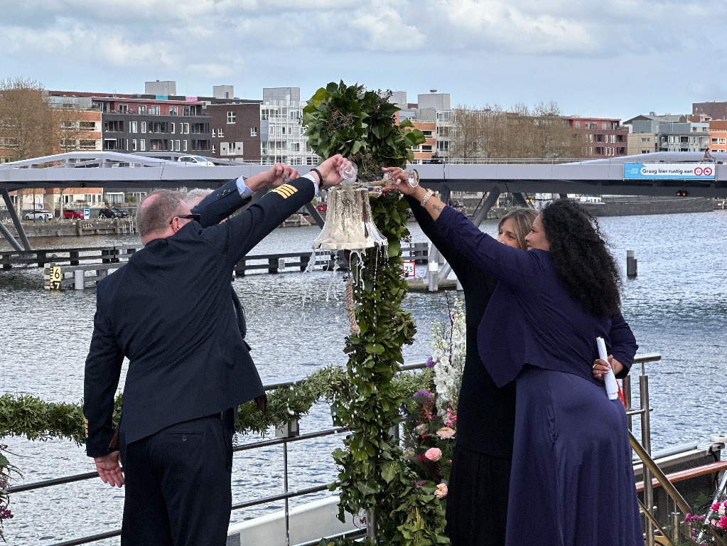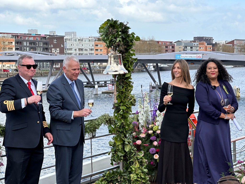 Instead of smashing a bottle of champagne on the bow of the ship into the Amstel river, the captain, godmother and Trafalgar and TTC Tour Brands executives poured champagne over Trafalgar Verity’s bell during the ceremony.