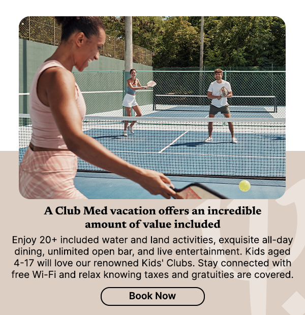 General Conditions: Offer is subject to capacity control and may increase or be withdrawn at any time. Blackout dates apply, including holidays and other dates. Offer requires a 1-night minimum stay (7-night for Columbus Isle). For Turkoise (Turks & Caicos) all guests must be at least 18 years of age. For Columbus Isle (Bahamas) all guests must be 2 years old and older, and stays can only be booked with air-inclusive packages. For Québec Charlevoix (Canada), applicable lodging tax, as required by the Ministry of Tourism of Québec, applies to the accommodation portion of your stay. Club Med Membership fees of $60 per adult and $30 per child are additional. Other restrictions apply including brochure terms and cancellation/change fees. Not responsible for errors or omissions. Void where prohibited or restricted by law. Québec permit.