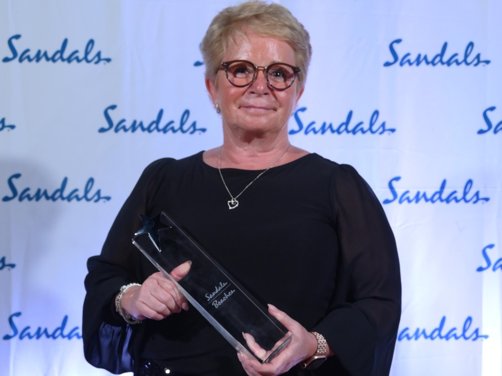 Rhonda Stanley, VP Talent Development, The Travel Agent Next Door accepts Top Beaches Agency- Canada award at Sandals Saint Vincent and the Grenadines.