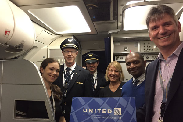 The new service offers convenient connections to the western US, Asia, and the South Pacific. In the photo the flight crew of the inaugural UA 565 and on the right Michael Scott, Sales Manager Specialty Sales Canada.
