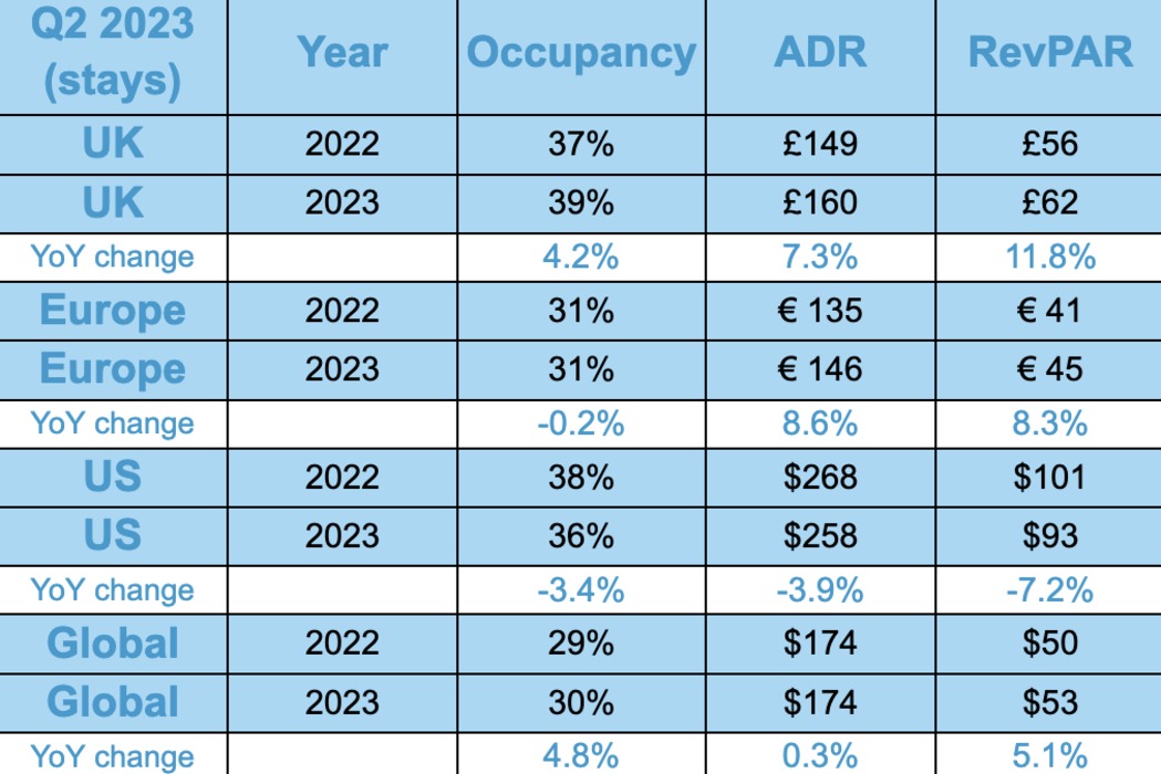 It notes that although Revenue per Available Rental (RevPAR) increased in Europe, in the UK, and globally during the first six months of the year, it fell sharply in the US, where occupancy hasn’t been making up for softer Average Daily Rates (ADRs).