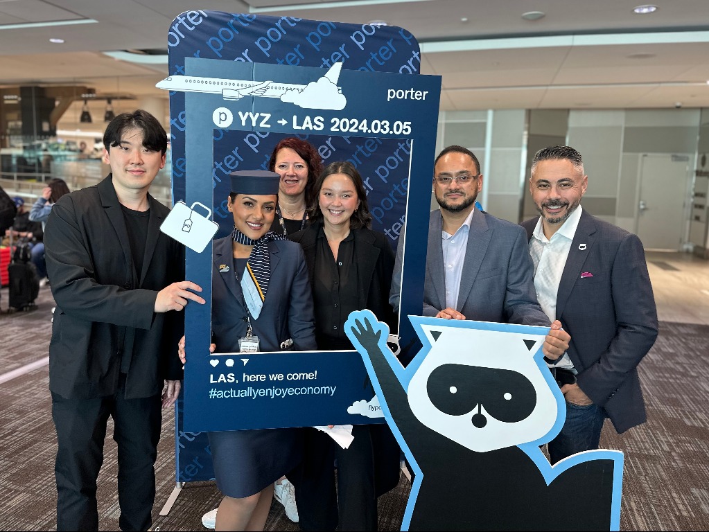 Bound for the Strip, Baxter Media was onboard the inaugural Porter Airlines flight from YYZ to LAS yesterday. Upon touching down at Las Vegas Harry Reid International Airport, the arriving passengers were greeted by showgirls, a symbol of the city’s renowned entertainment scene.