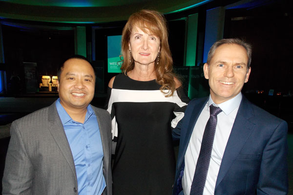 WestJet’s chief digital and innovation officer, Alfredo Tan (l) and its executive vice-president, commercial, Tim Croyle (r) chat with HRG North America’s vice-president, Sherry Scott.