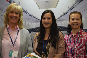 Pat Smith, the program manager for sales at WestJet (l.) met with travel agent Delores Lee of Creative Travel in Vancouver (c.) and agent Helen Lee, also of Creative Travel, during the WestJet Travel Trade Expo in Vancouver last week.